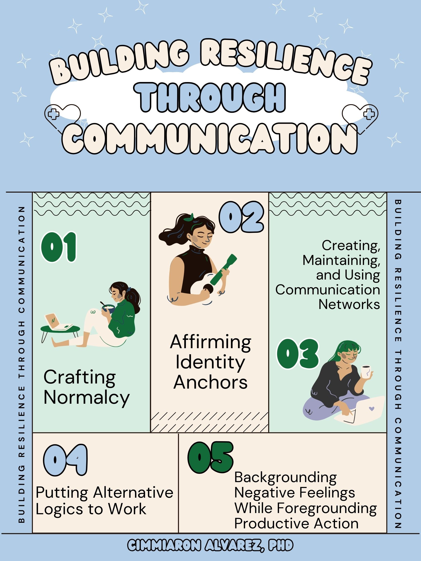 Throughout life, we experience a variety of difficulties. At some point in our lives, friendships will end; we will go through a break-up with a romantic partner; we might have difficulty in school or work; we will experience loss and grief. Despite how common hardships are for individuals, for decades scholars conceptualized resilience, or the ability to establish a new normal following hardship (Buzzanell, 2010), as a trait. In other words, some people were inherently more resilient than others and there was nothing that a person could do to be more resilient. Buzzanell challenged this idea and established that resilience is communicative. Thus, we can communicate in ways that help us be more resilient through five processes: (a) crafting normalcy, (b) affirming identity anchors, (c) creating, maintaining, and using communication networks, (d) putting alternative logics to work, and (e) backgrounding negative feelings while foregrounding productive action. Below, I will explain each of these resilience processes and provide examples about how you might enact them when you are experiencing difficulties.