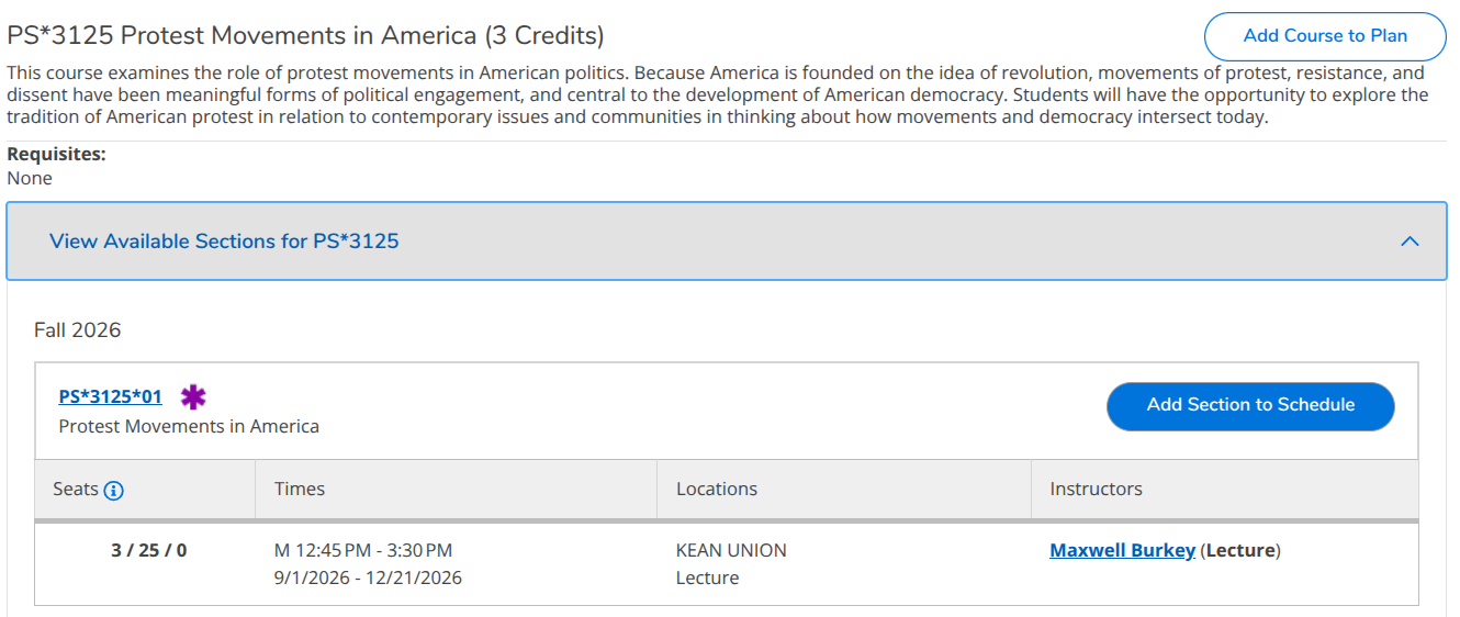 In the Fall 2026 semester, I will offer a new course at Kean University, PS 3125-01: Protest Movements in America, that will explore the contributions of student politics to American democracy.